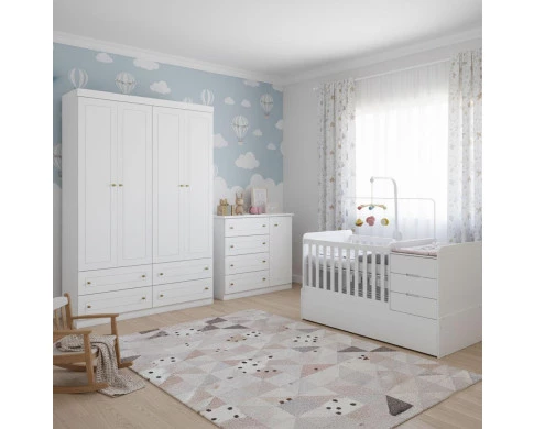 Quarto Infantil 4 Portas Americano com Berço Multifuncional Cleo Ambiente Branco Fosco - Henn