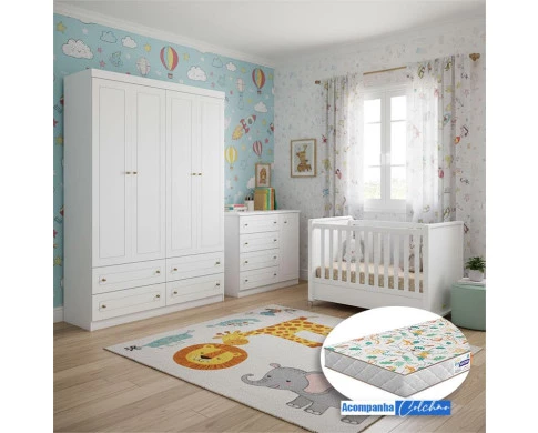 Quarto Infantil 4 Portas Americano com Berço Tutto New Ambiente Branco Fosco e Colchão Gazin - Matic
