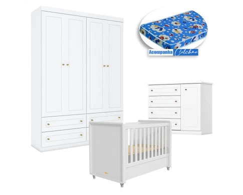 Quarto Infantil 4 Portas Mississipi com Berço Tutto New Branco Fosco e Colchão Ortobom - Matic