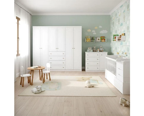 Decore o quarto do bebê com móveis sofisticados e modernos! Apresentamos o Berço Multifuncional Cleo desenvolvido pela Carolina Móveis e a Cômoda e Guarda Roupa Infantil 6 Portas da linha Americano produzido pela Henn. Berço com função cama, grade fixa e cama auxiliar, acompanha colchão Ortobom no padrão americano 70x130. Guarda Roupa Americano com frente em MDF usinada em baixo relevo, prateleiras internas e Cômoda com lindo design, gavetas com corrediças telescópicas e porta lateral podendo ser utilizada como sapateira. Confira mais detalhes e não deixe de adquirir!