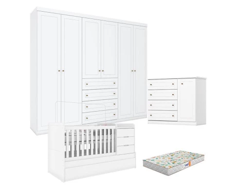 Quarto Infantil 6 Portas Americano com Berço Multifuncional Cleo Branco Fosco e Colchão Gazin - Henn