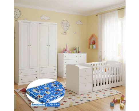 Quarto Infantil Americano 4 Portas e Berço Multifuncional Atlanta Ambiente Branco Fosco com Colchão Ortobom - Reller