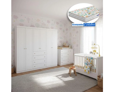 Quarto Infantil Americano 6 Portas Ambiente com Berço Tutto New Branco Fosco e Colchão Gazin - Henn