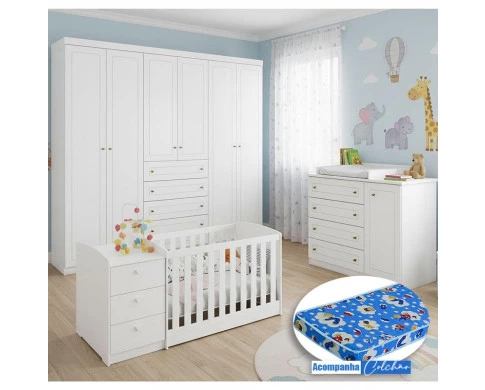 Quarto Infantil Americano 6 Portas com Berço Multifuncional Atlanta Ambiente Branco Fosco e Colchão Ortobom - Reller