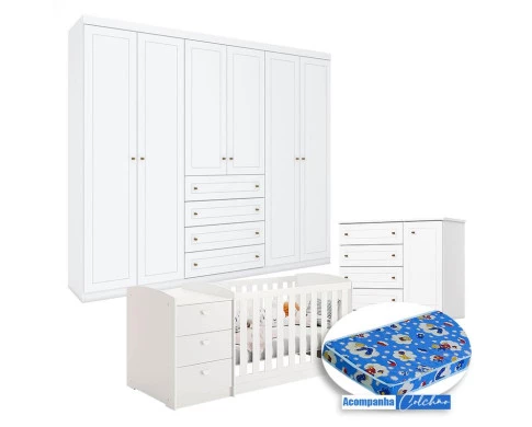Quarto Infantil Mississipi 6 Portas com Berço Multifuncional Atlanta Branco Fosco e Colchão Ortobom - Reller