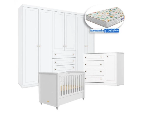 Quarto Infantil Mississipi 6 Portas com Berço Tutto New Branco Fosco e Colchão Gazin - Henn