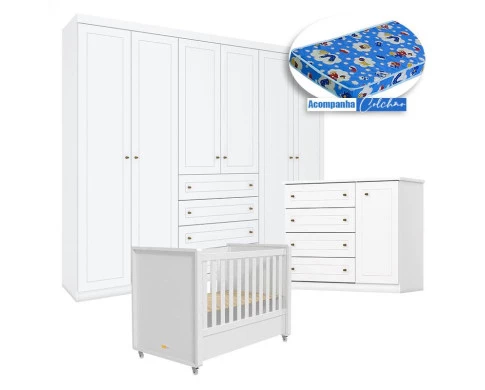 Quarto Infantil Mississpi 6 Portas com Berço Tutto New Branco Fosco e Colchão Ortobom - Henn