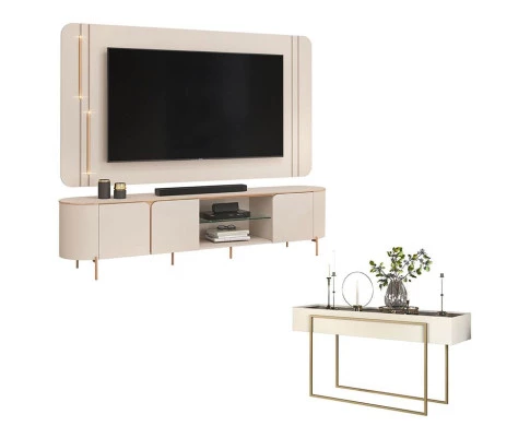 Está procurando móveis para montar sua sala? Apresentamos para você este belo conjunto composto pelo Rack Bancada com Painel e o Aparador da linha Pilar, fabricados pela DJ Móveis. O rack bancada possui bordas arredondadas, três portas com cantos curvos, uma prateleira em vidro é perfeito para acomodar seus aparelhos eletrônicos, além de pés metálicos na cor dourado, o painel segue o mesmo design com cantos arredondados e dois tubos metálicos com LED intercalados, que podem ser instalados em ambos os lados. O aparador possui um design moderno e sofisticado, perfeito para complementar seu ambiente. É um produto versátil, que pode ser usado no hall de entrada, na sala de jantar ou na sala de estar, ideal para receber decorações, arranjos florais e utensílios como bandejas e taças, servindo de apoio e organizando o seu dia-a-dia. Combinando praticidade, design e sofisticação, é perfeito para quem está buscando qualidade e sustentabilidade para elevar o estilo do seu ambiente. Confira e aproveite!