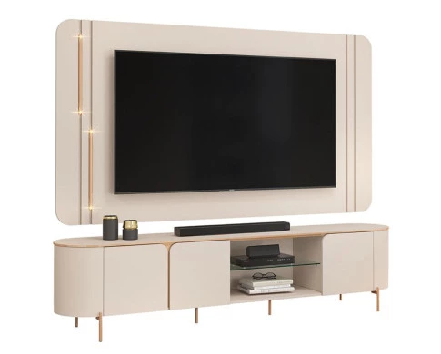 Começou a montar sua sala? Então apresentamos para você este belo conjunto composto pelo rack e painel da linha Ariana. O rack conta com as bordas arredondadas e três portas com cantos curvos, proporcionando um acabamento refinado e suave. Com uma prateleira em vidro é perfeito para acomodar seus aparelhos eletrônicos, além de pés metálicos na cor dourado. Completando o conjunto, o painel segue o mesmo design com cantos arredondados e dois tubos metálicos com LED intercalados, que podem ser instalados em ambos os lados. Fabricados pela DJ Móveis, são desenvolvidos em 100% MDF com chapas de madeiras reconstituídas provenientes de reflorestamento. Suportando TVs de até 75 polegadas é perfeito para quem está buscando um ambiente moderno, sofisticado e com acabamento impecável. Confira e aproveite!