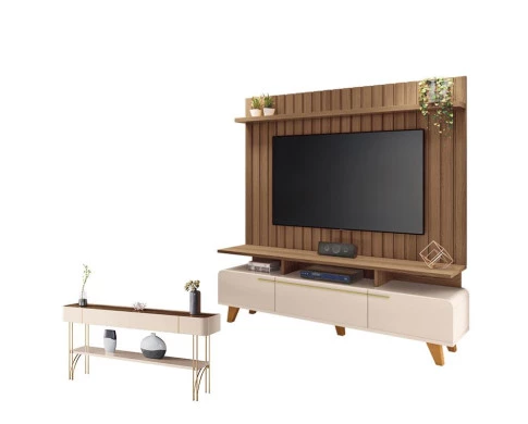Rack Bancada Essenza e Painel Link 2.0 com Aparador Vivant Off White Castanho – HB Móveis