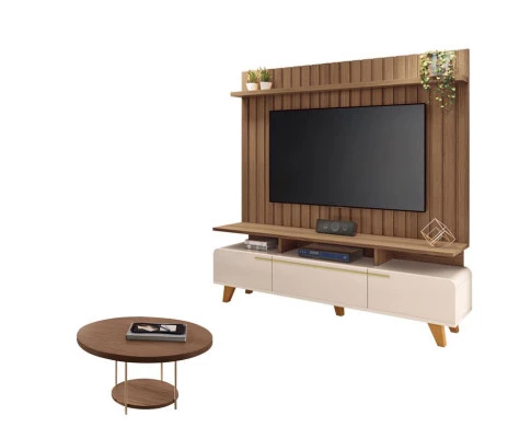 Rack Bancada Essenza e Painel Link 2.0 com Mesa de Centro Sky Off White Castanho – HB Móveis