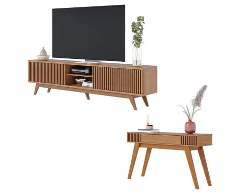 Apresentamos este conjunto de Rack Bancada Fortaleza e Aparador Riviera, fabricados pela Colibri. O rack possui quatro portas de giro com o detalhe ripado nas portas, dois nichos para melhor acomodar seus aparelhos eletrônicos, e duas prateleiras para organizar seus objetos. O aparador possui 01 gaveta central com corrediças telescópicas, puxador metálico dourado fosco, ripado artesanal nas laterais, peças traseiras com acabamento possibilitando a utilização do móvel para divisão de ambientes, pés em madeira maciça. Fabricados com materiais de alta qualidade que garante resistência e durabilidade aos produtos. Confira mais detalhes e aproveite!
