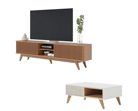Apresentamos este conjunto de Rack Bancada Fortaleza e Mesa de Centro Jeri, fabricados pela Colibri. O rack possui quatro portas de giro inspirado nas maiores tendências com o detalhe ripado nas portas trazendo delicadeza e sofisticação, dois nichos para melhor acomodar seus aparelhos eletrônicos, e duas prateleiras para organizar seus objetos. A mesa possui dois nichos internos, pés em madeira maciça dando estalibilidade e um toque sofisticado. Seja para sua sala de estar, sala de tv ou até mesmo em salas de espera de ambientes de escritório, servindo como apoio para revistas, vasos e demais objetos decorativos. Fabricados com materiais de alta qualidade que garante resistência e durabilidade aos produtos. Confira mais detalhes e aproveite!