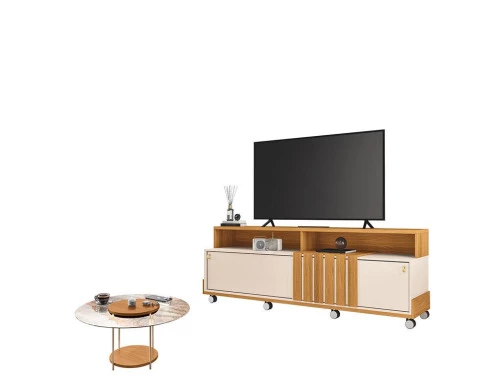 Rack Bancada Graci 1.8 com Mesa de Centro Sky com Tampo de Vidro Off White Cinamomo – HB Móveis