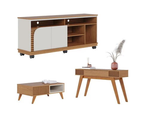 Está procurando móveis para montar sua sala? Apresentamos para você este belo conjunto composto pelo Rack Bancada com Mesa de Centro Jeri e Aparador Riviera, fabricados pela DJ Móveis. O rack possui duas portas giro com detalhe ripado, cinco nichos, uma prateleira, e vem equipado com rodízios proporcionando flexibilidade e praticidade para seu ambiente. A mesa possui detalhe ripado artesanal, nichos interno em dois lados de forma espelhada e pés em madeira maciça. O aparador possui 01 gaveta central com corrediças telescópicas, puxador metálico dourado fosco, ripado artesanal nas laterais, peças traseiras com acabamento possibilitando a utilização do móvel para divisão de ambientes e pés em madeira maciça. Combinando praticidade, design e sofisticação, é perfeito para quem está buscando qualidade e sustentabilidade para elevar o estilo do seu ambiente. Confira e aproveite!