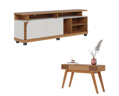 Apresentamos este conjunto de Rack Bancada Jurerê 1.8 e Aparador Riviera, fabricados pela Colibri. O rack possui duas portas giro que garantem mais qualidade e fácil acesso ao seu interior, detalhe ripado na lateral dando um toque de elegância. Para facilitar a movimentação e limpeza vem equipado com rodízios proporcionando flexibilidade e praticidade para seu ambiente. Possui cinco nichos abertos e uma prateleira, amplo espaço para diversos itens desde eletrônicos até objetos decorativos. O aparador possui 01 gaveta central com corrediças telescópicas, puxador metálico dourado fosco, ripado artesanal nas laterais, peças traseiras com acabamento possibilitando a utilização do móvel para divisão de ambientes, pés em madeira maciça. Fabricados com materiais de alta qualidade que garante resistência e durabilidade aos produtos. Confira mais detalhes e aproveite!