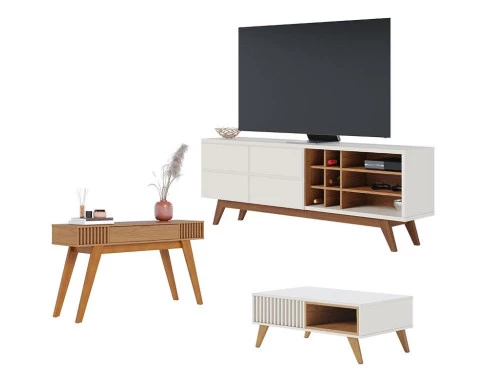 Rack Bancada Noronha 1.8 com Mesa de Centro Jeri Off White Matte Freijó e Aparador Riviera Freijó – Colibri
