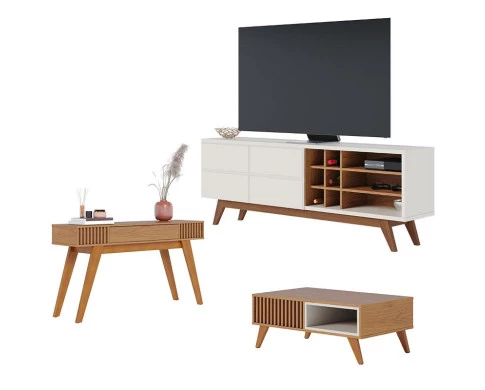 Rack Bancada Noronha 1.8 Off White Matte Freijó com Mesa de Centro Jeri Freijó Off White e Aparador Riviera Freijó – Colibri
