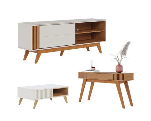 Rack Bancada Otawa com Mesa de Centro Jeri Off White Freijó e Aparador Riviera Freijó – Colibri