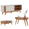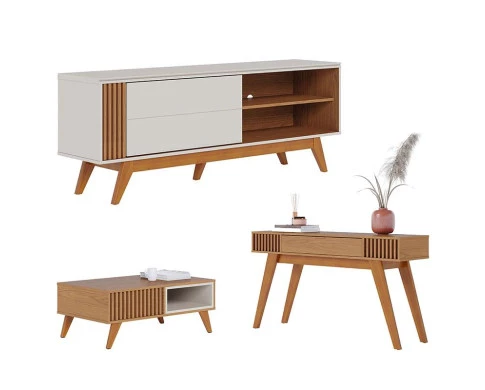 Rack Bancada Otawa Off White Freijó com Mesa de Centro Jeri Freijó Off White e Aparador Riviera Freijó – Colibri