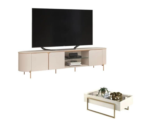 Está procurando móveis para montar sua sala? Apresentamos para você este belo conjunto composto pelo Rack Bancada e Mesa de Centro da linha Suri, fabricados pela DJ Móveis. O rack bancada possui bordas arredondadas, três portas com cantos curvos, uma prateleira em vidro é perfeito para acomodar seus aparelhos eletrônicos, além de pés metálicos na cor dourado, garantindo charme e resistência. A mesa possui design totalmente moderno e sofisticado que deixa o ambiente lindo e luxuoso, sem contar que combina com qualquer decoração e deixa sua sala de estar com um toque refinado. Combinando praticidade, design e sofisticação, é perfeito para quem está buscando qualidade e sustentabilidade para elevar o estilo do seu ambiente. Confira e aproveite!