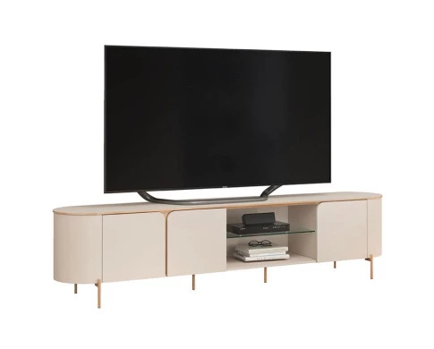 Está montado a sua sala? Apresentamos para você este belo rack da linha Ariana. Apresenta bordas arredondadas e três portas com cantos curvos, dando um visual moderno e suave. Possuindo uma prateleira em vidro para acomodar seus aparelhos eletrônicos, além dos pés em metal na cor dourado, garantindo charme e resistência. Fabricado pela DJ Móveis, é desenvolvido em 100% MDF proveniente de madeira de reflorestamento. Com capacidade para TVs de até 75 polegadas, será a escolha perfeita para compor seu ambiente com mais sofisticação e organização. Confira e aproveite!