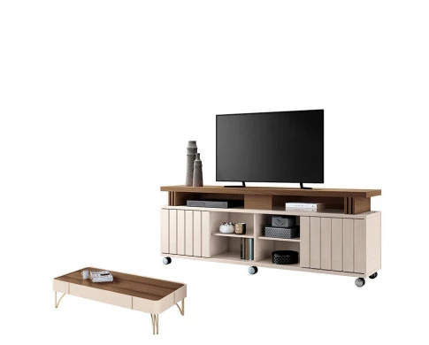 O rack da linha Rivera 1.8 possui duas portas de correr com detalhes ripados dando um toque exclusivo e sofisticado. Conta com duas prateleiras removíveis, oferecendo flexibilidade para organizar seus aparelhos eletrônicos e com a Mesa de Centro dá aquele toque mais delicado para sua sala de estar. Os rodízios permite a fácil movimentação, facilitando a limpeza. Com dimensões generosas, é ideal para TVs de até 70 polegadas. A mesa de centro da linha Sorelle complementa o conjunto, o tampo em 100% MDF garante durabilidade e resistência. O acabamento das bordas em pintura P.U proporciona um visual impecável e elegante. Os pés em madeira maciça acrescentam robustez e charme. Fabricados pela HB Móveis são desenvolvidos em MDP/ MDF de alta qualidade, garantindo design, funcionalidade e durabilidade. Com este conjunto, sua sala de estar ficará mais elegante, organizada e pronta para receber seus momentos de lazer. Confira e garanta o seu!