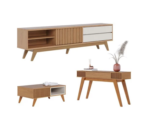 Rack Bancada Veneza com Mesa de Centro Jeri Freijó Off White Matte e Aparador Riviera Freijó - Colibri