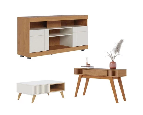 Rack Bancada Yara Freijó Off White com Mesa de Centro Jeri Off White Freijó e Aparador Riviera Freijó – Colibri